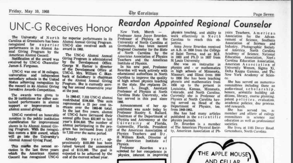 Spartan Stories- Flying High at the Woman’s College: UNCG Archives blog post about a 1946 class taught by Dr. Reardon titled “Elements of Aeronautics”.